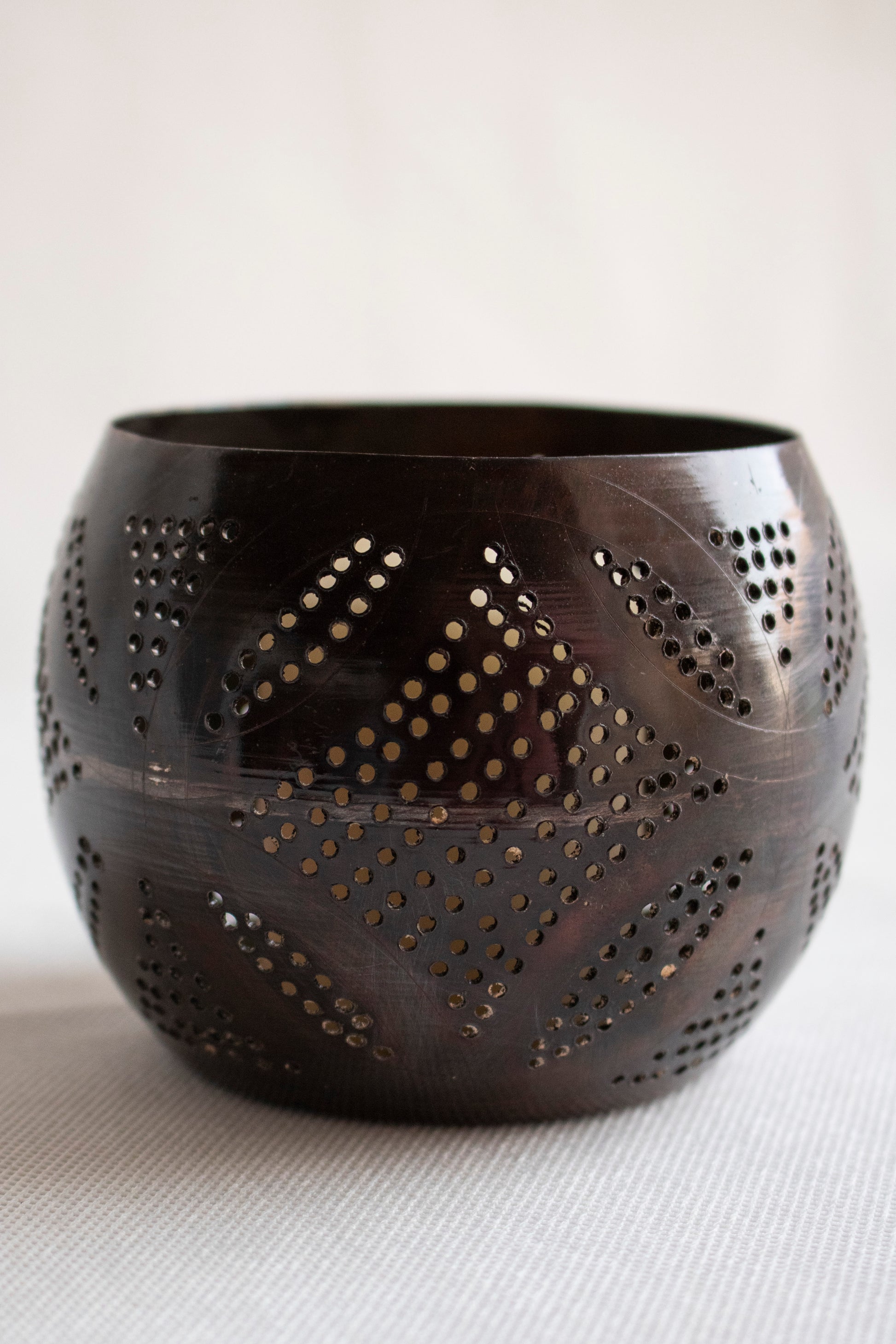 This handcrafted metal candle holder features a rounded bowl silhouette with intricate geometric perforations inspired by traditional craftsmanship. Designed to softly diffuse candlelight, the perforated patterns create a warm, atmospheric glow when lit.