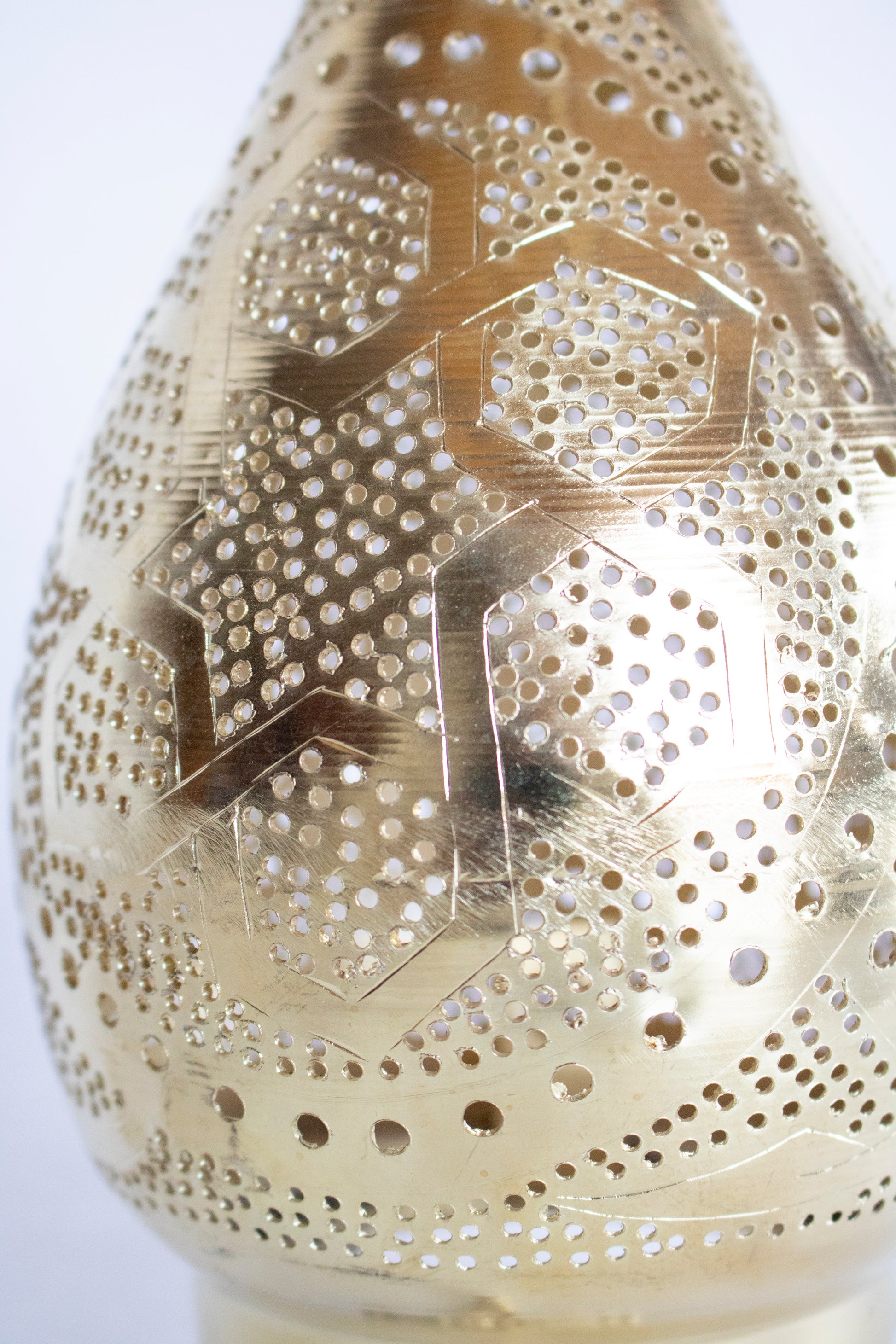 An elegant handcrafted metal lantern featuring a warm gold finish and an organically shaped silhouette. The intricate hand-perforated patterns allow candlelight to gently pass through, creating beautiful ambient shadows and a cozy atmosphere.
